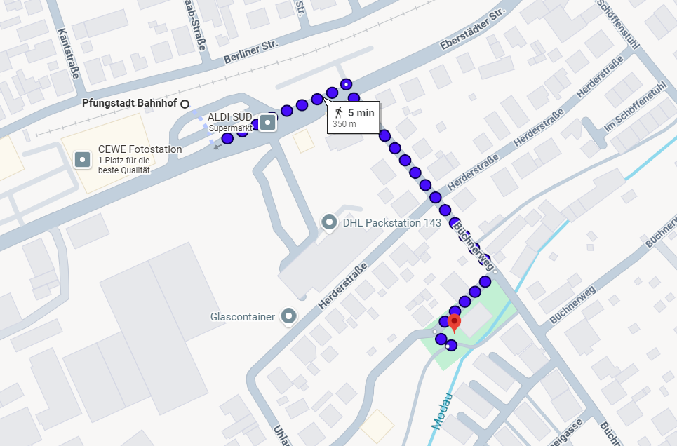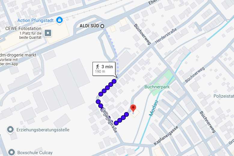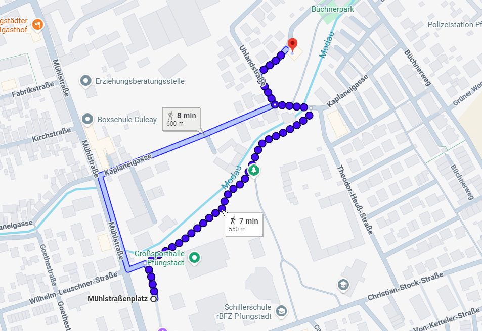 An allen anderen Tagen steht dir außerdem der Mühlstraßenplatz zur Verfügung. Von dort erreichst du den Büchnerpark in nur etwa sieben Minuten zu Fuß.